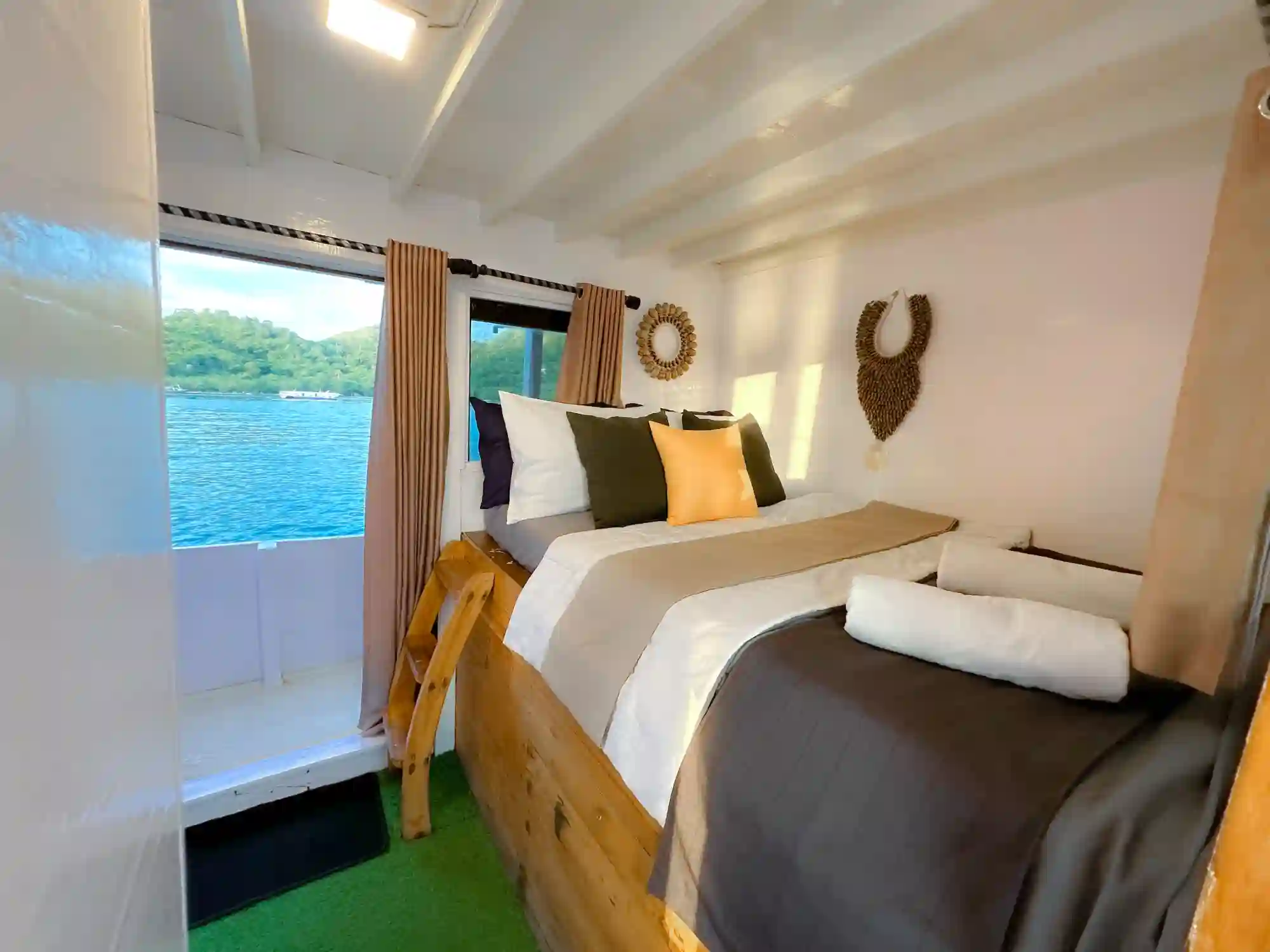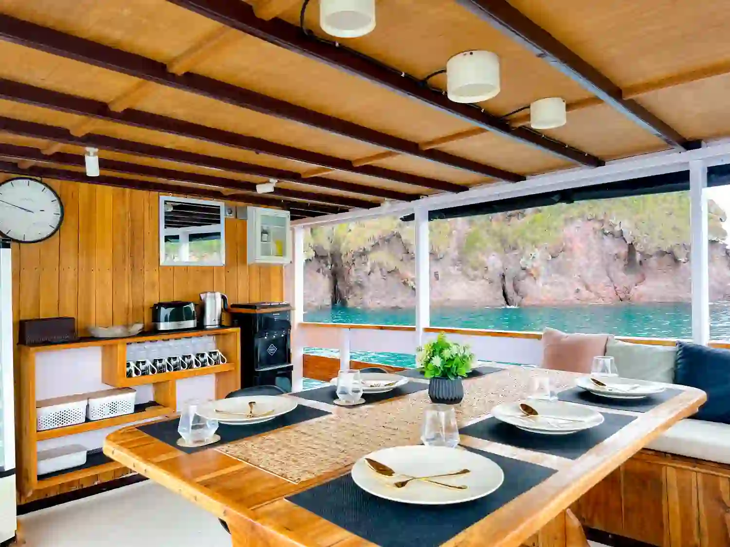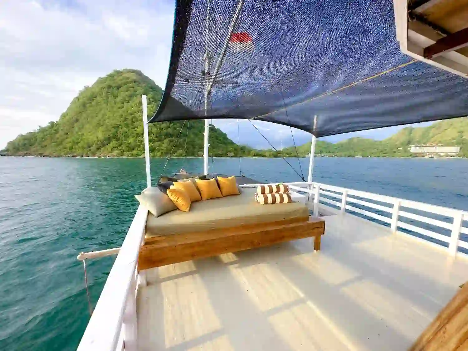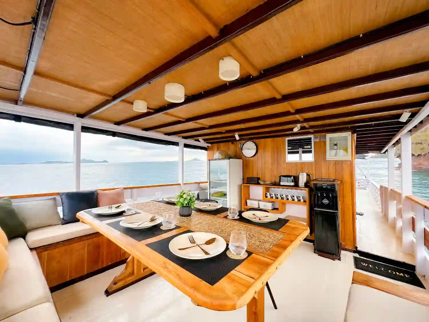 Kapal Santemako menawarkan atmosfer bersahabat dan homey yang cocok untuk perjalanan keluarga kecil, pasangan, maupun solo traveler. Tidak hanya itu, Anda juga akan dimanjakan dengan sajian makanan lezat khas lokal selama berlayar. Bayangkan menyantap makan siang dengan latar perbukitan hijau dan laut biru di tengah laut Flores—sensasi liburan yang hanya bisa Anda rasakan di sini!